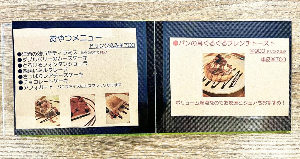 メニューは、食事・軽食・ドリンク・デザートと豊富です。